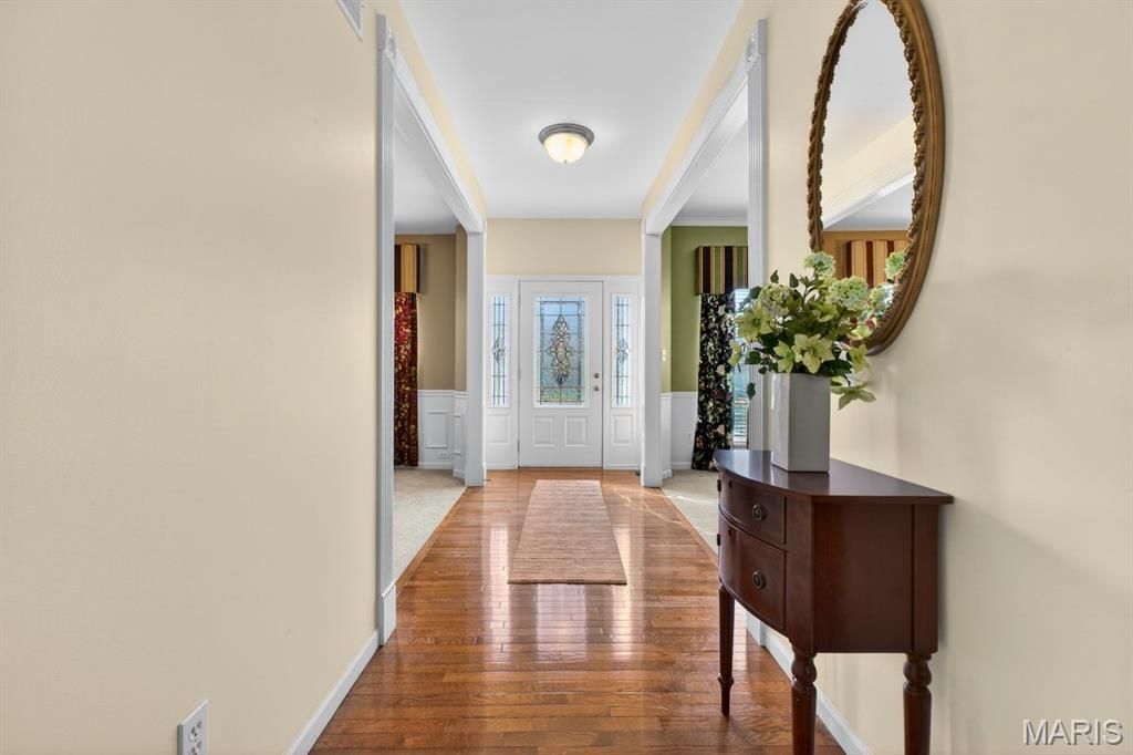Welcome to 1548 Hunters Meadow Dr, a beautifully maintained 2-story home nestled in an established neighborhood in O'Fallon. With over 3,000 square feet of living space, this home offers the perfect blend of comfort, functionality, and timeless style. From the stately columned front porch to the spacious interior layout, every space feels inviting and thoughtfully designed. Inside, hardwood floors lead you through formal living and dining areas, while the family room features a warm brick fireplace with built-ins and large windows that bring in natural light and views of the wooded backyard. The kitchen offers generous cabinetry, a center island with seating, and an adjoining breakfast room that opens to the patio - making it easy to entertain or enjoy quiet mornings at home. Upstairs, the vaulted primary suite provides a relaxing retreat with a spacious bath, soaking tub, separate shower, and large vanity. Additional bedrooms offer flexibility for family, guests, or a home office. Situated on a lot that backs to trees, the backyard offers privacy and a peaceful setting, while the 3-car garage provides plenty of room for vehicles and storage. The full basement is oversized with additional space under the garage!A home with space to live, entertain, and grow - all in a desirable O'Fallon location.This isn't just square footage - it's a home that lives well. Siding, Roof and 2 furnaces are 1 year old. 2 AC compressors are 2 years old.