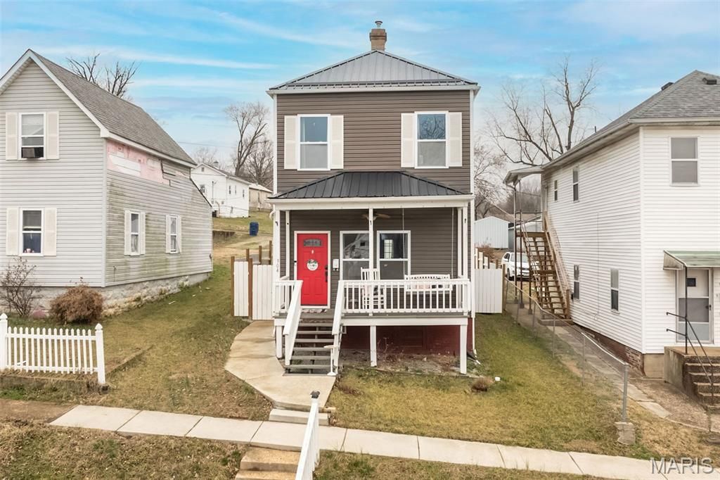 Highlight of the block and impossible to miss, this modern craftsman steals the curb appeal show with its bold red door, crisp white trim, and sleek metal roof! Step inside and you'll instantly love the character-meets-clean-lines vibe. Exposed brick adds warmth, while bright white cabinetry, stainless steel appliances, and a generous center island anchor the updated kitchen. The open layout flows effortlessly into the living space, complete with custom built-ins that frame the perfect TV wall. Main floor laundry + full bath = everyday convenience done right! Upstairs, you'll find two spacious bedrooms including a private primary suite with full bath. Neutral finishes, great natural light, and truly move-in-ready condition make this an easy yes for first-time buyers. Outside, enjoy the covered front porch (coffee spot secured), a fully fenced yard perfect for kids and furry kids alike, plus a poured patio and sidewalks connecting front to back for easy, low-maintenance living. And the location is amazing! Walk to downtown De Soto's cute shops, local dining spots, and nearby churches. Stylish. Efficient. Adorable. If you've been waiting for the one that feels different than everything else on the market . . . YOU JUST FOUND IT!